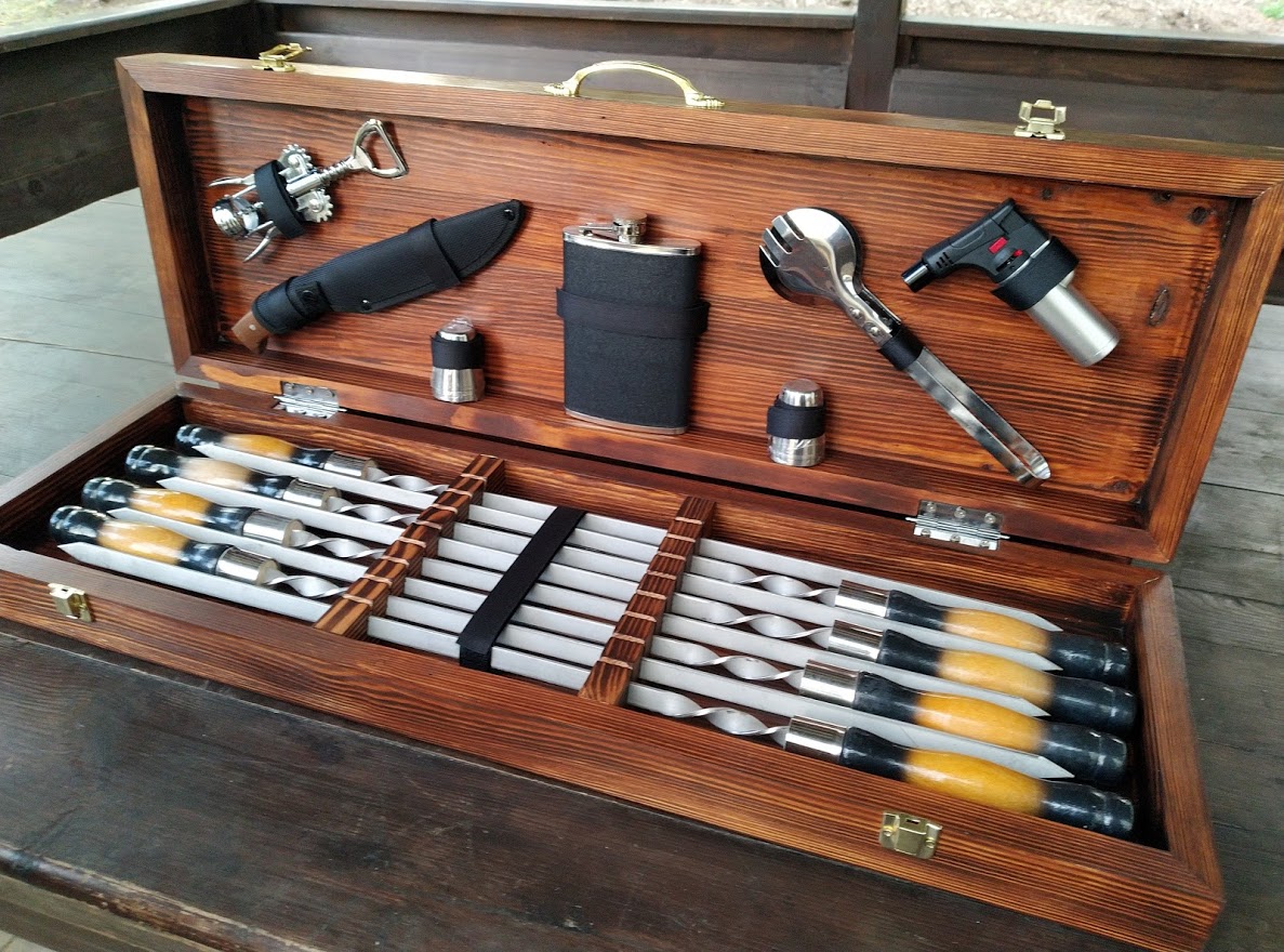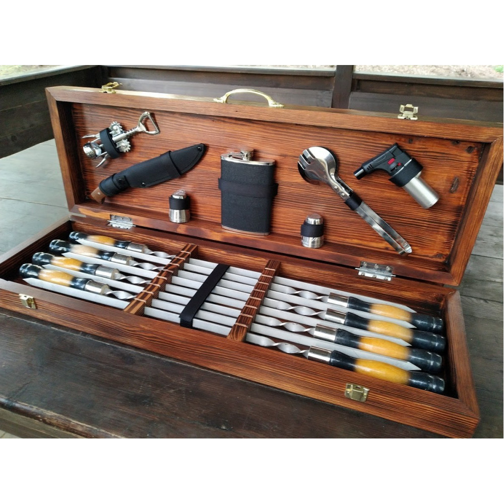 Шампура і аксесуари упаковані в дерев'яний кейс ручної роботи, що надає подарунку ще більшу цінність і преміальність.