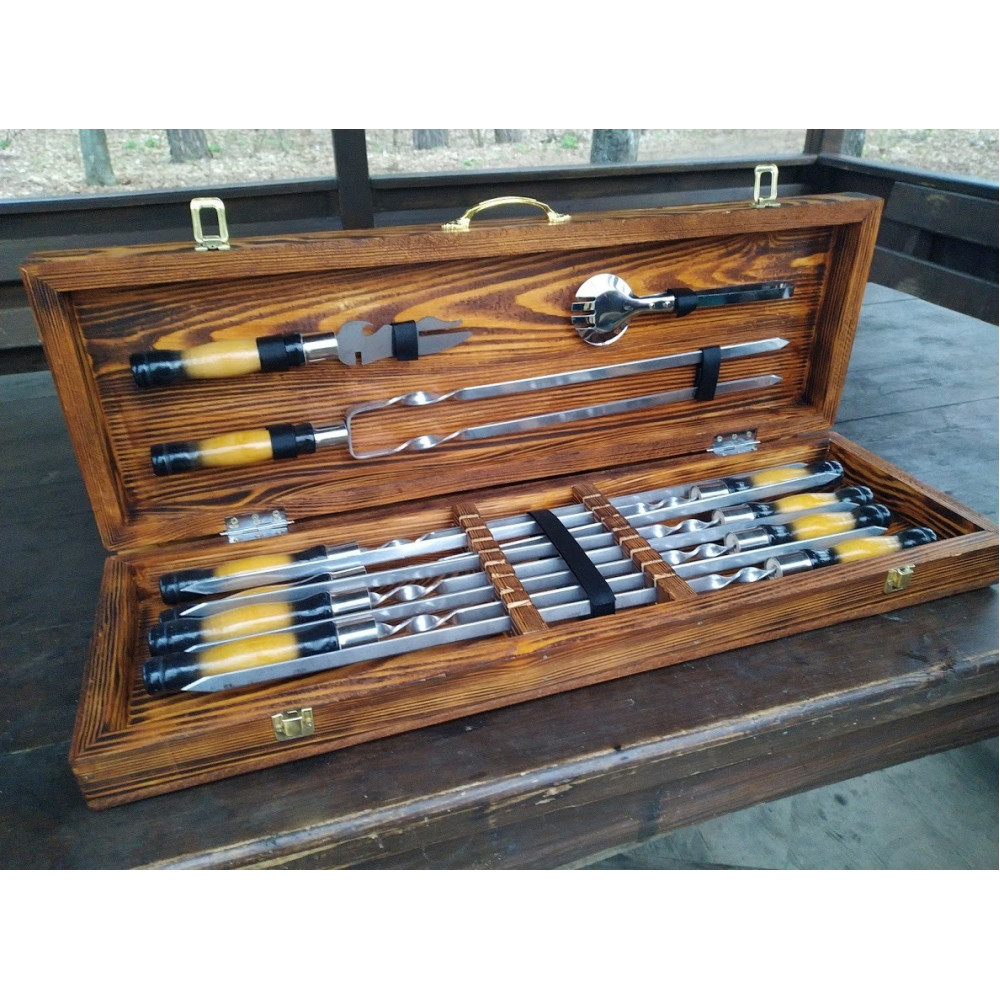 Шампура і аксесуари упаковані в дерев'яний кейс ручної роботи, що надає подарунку ще більшу цінність і преміальність.