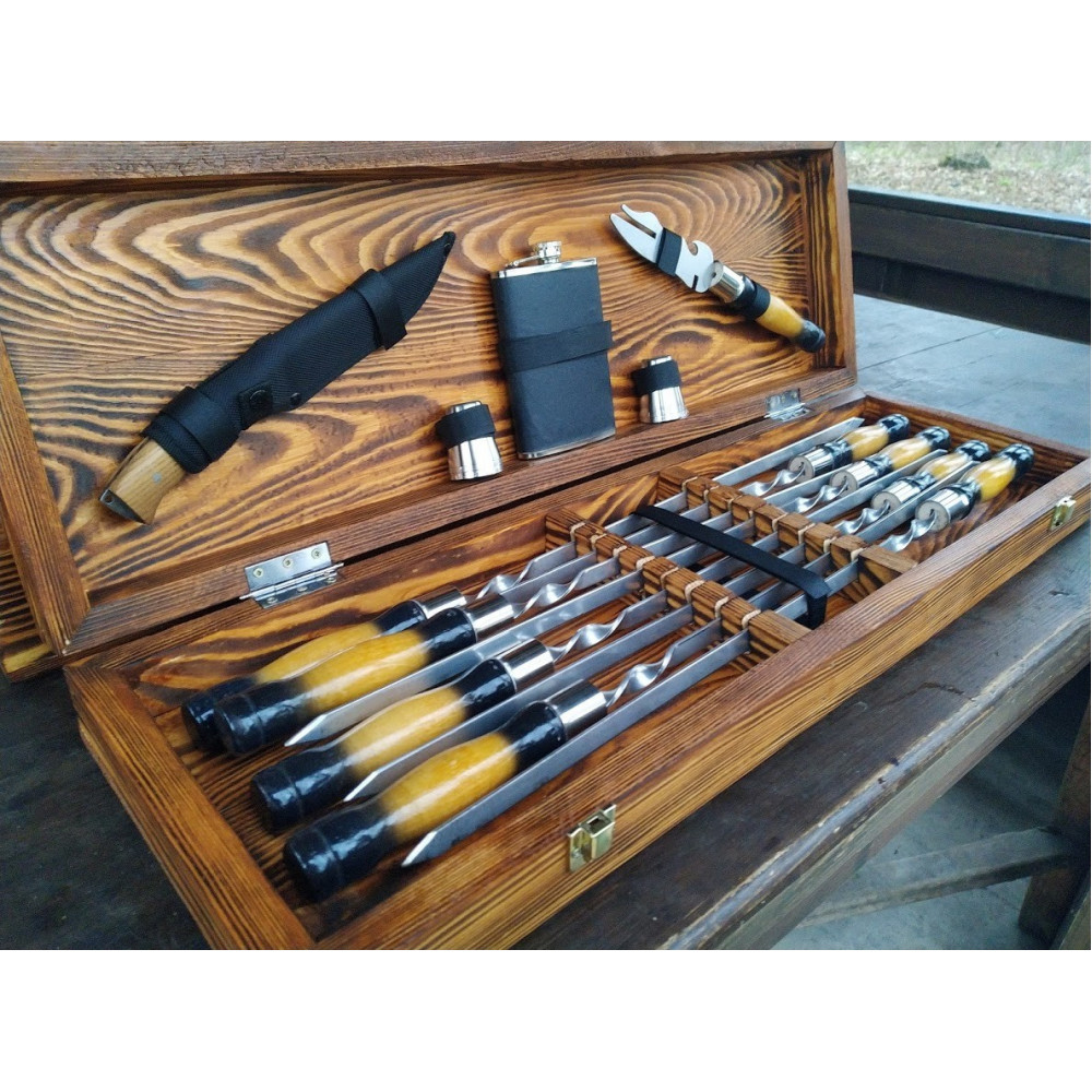 Шампура і аксесуари упаковані в дерев'яний кейс ручної роботи, що надає подарунку ще більшу цінність і преміальність.