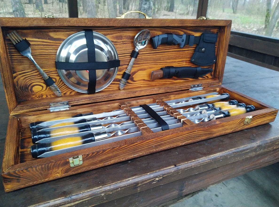 Шампура і аксесуари упаковані в дерев'яний кейс ручної роботи, що надає подарунку ще більшу цінність і преміальність.