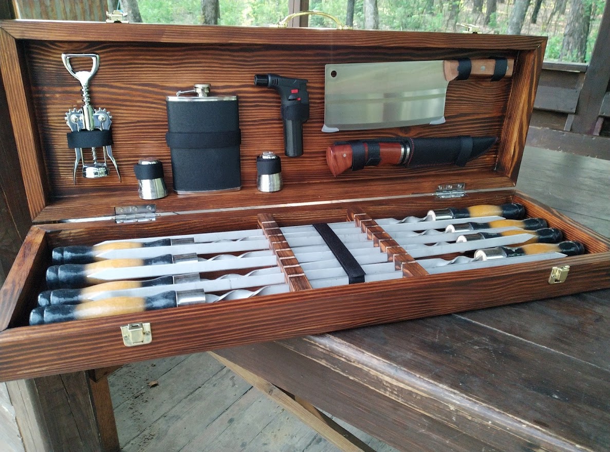 Шампура і аксесуари упаковані в дерев'яний кейс ручної роботи, що надає подарунку ще більшу цінність і преміальність.