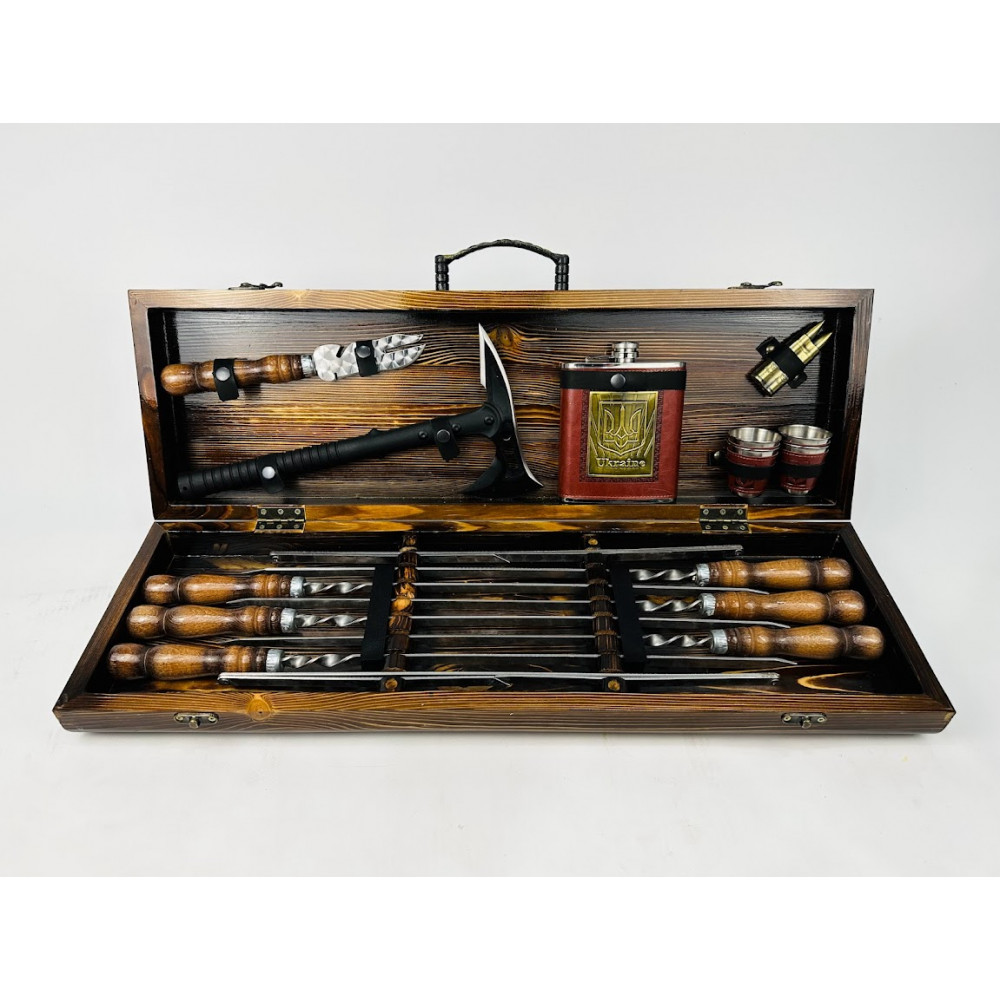 Презентабельний, тому що упакований в красивий дерев'яний кейс. Корисний, тому що максимально спростить приготування страв. Функціональний, тому що в кейсі є все необхідне для приготування різноманітних страв на мангалі або грилі.