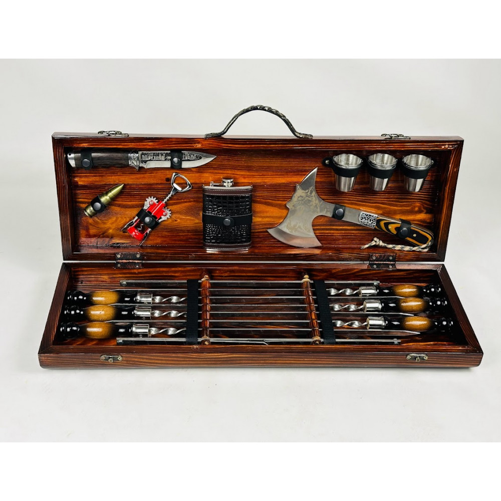 Презентабельний, тому що упакований в красивий дерев'яний кейс. Корисний, тому що максимально спростить приготування страв. Функціональний, тому що в кейсі є все необхідне для приготування різноманітних страв на мангалі або грилі.