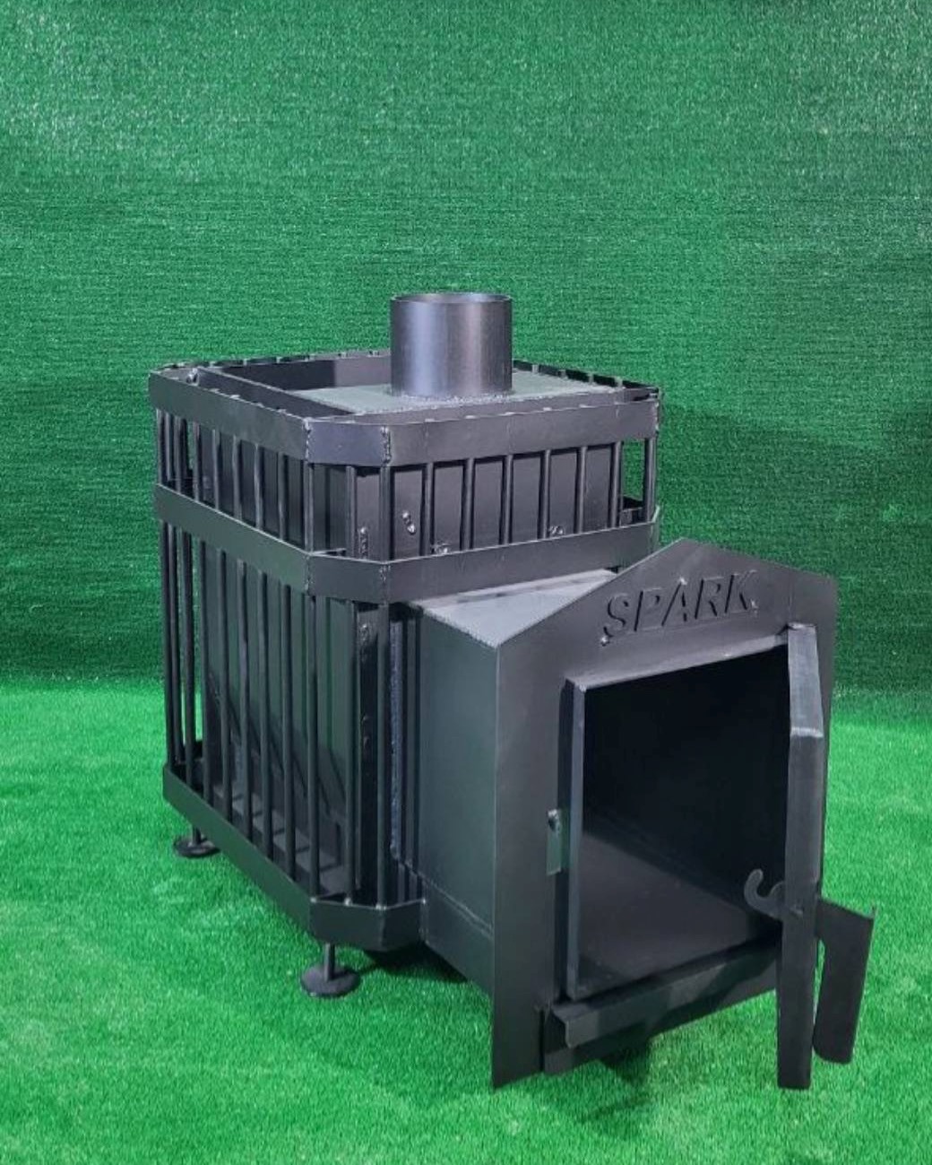 - Піч для лазні кам'янка з функцією подачі пари. В основі конструкції передбачена спеціальна парова гармата: у процесі подачі води через вирву надходить дрібнодисперсна пара, м'яка для дихання людини. Також є місткий зольник для попелу, колосник змінного типу. Щоб встановити піч на будь-якій поверхні (навіть на нерівній) модель була укомплектована ніжками з можливістю регулювання. У процесі експлуатації використовують поліна довжиною до 50 см, каміння – близько 130 кг. Димар 120 мм.
