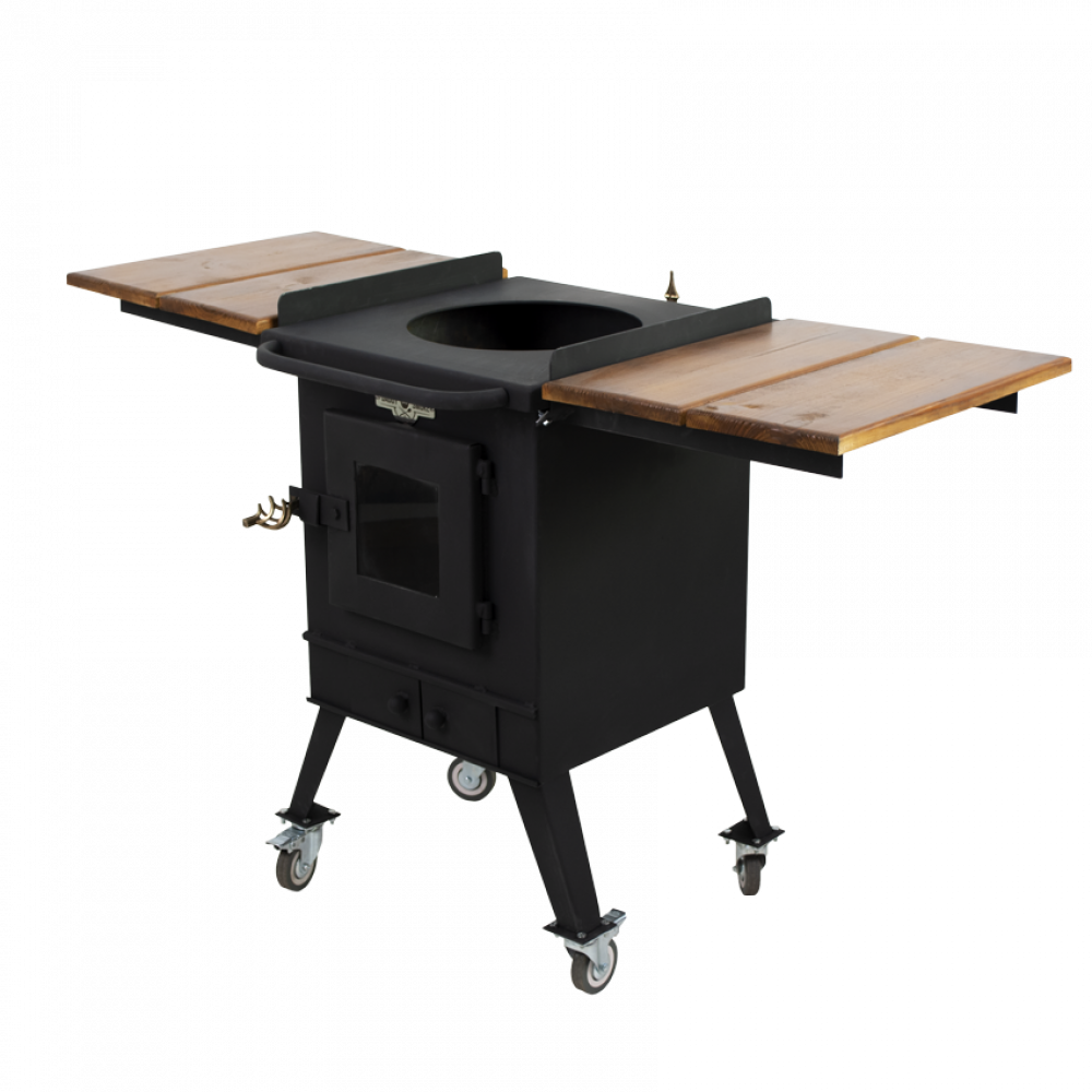 Піч під казан Daddy Smoke колосникового типу – оригінальне доповнення дачної ділянки та можливість побалувати рідних смачними м'ясом, рибою, стейками, овочами, приготованими на природі. Для зручності, з боків розташовані дві дерев'яні полиці, призначені для підготовки продуктів, посуду або спецій. У нижній частині жаровні знаходиться отвір для видалення золи. Наявність коліс та зручної ручки дозволяє її легко транспортувати до місця готування.