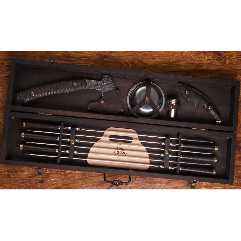 Примітною особливістю є дизайн дубових ручок шампурів, які прикрашені бронзовим закінченням, виконаним у техніці художнього лиття з ефектом чорніння. Деталі надзвичайно вражаючі та виглядають вишукано.