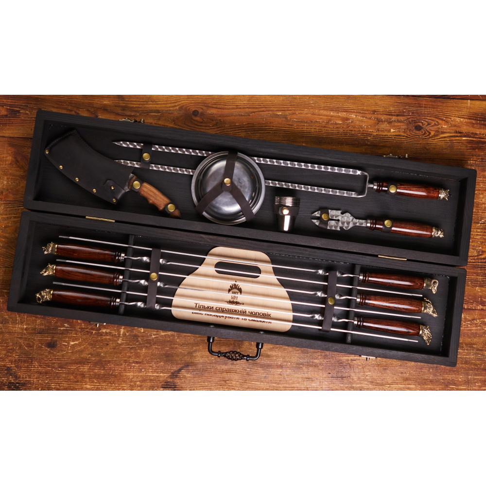 Використовуються лише натуральні матеріали: нержавіюча сталь, якісна шкіра, бронза, дерево. Жодного пластику! Ручки шампурів прикрашені головами тварин, виконаними у техніці художнього лиття. Все упаковане в стильний кейс із натурального дерева.