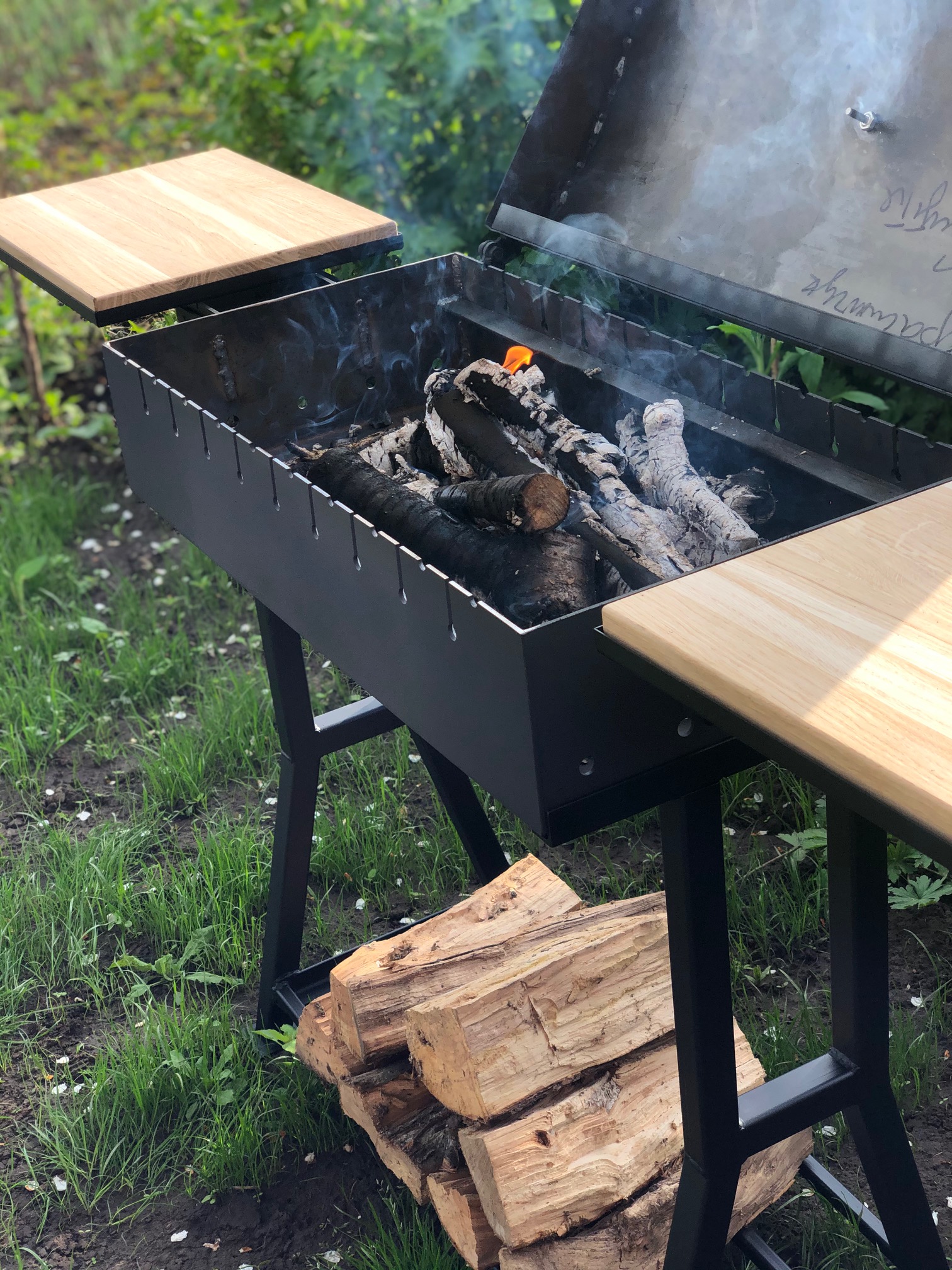 Жаровня виготовлена з металу 3 мм і посилена ребром жорсткості, який також може виконувати роль підставки пож грати гриль.